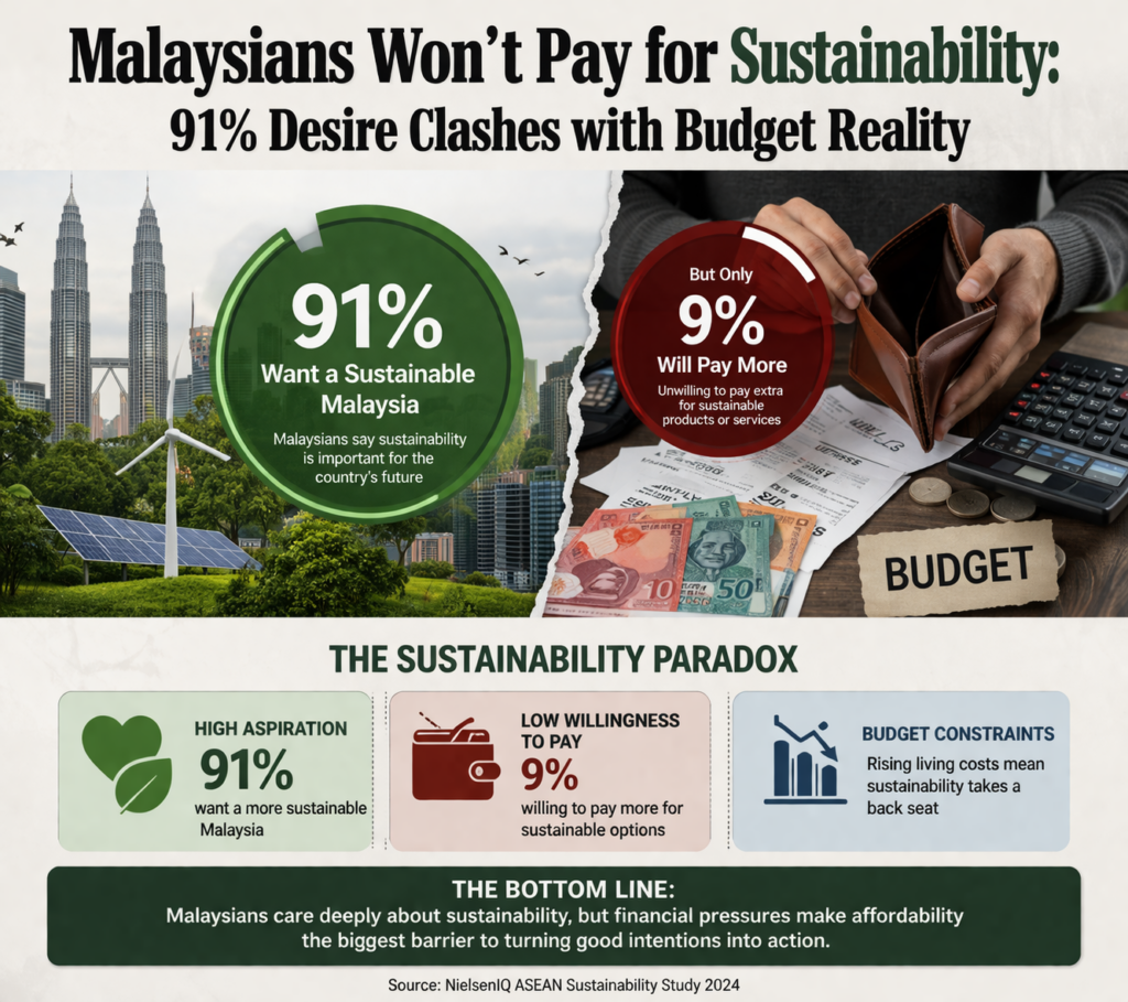 KUALA LUMPUR, 17th September 2025 — According to the Malaysia Consumer Trend Report 2025, a nationwide survey of 500 Malaysians has found that 91% of consumers are open to the idea of purchasing sustainable products. However, this intention is heavily tempered by price sensitivity, with the majority only willing to pay less than 10% more, revealing a significant gap between eco-conscious desires and purchasing reality.